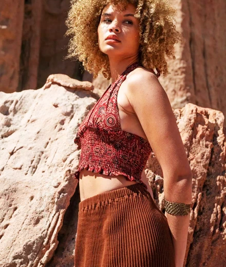 This shirred halter features a striking textured pattern created using the intricate block print craft, “ajrakh,” practiced by South Asian artisans for centuries.
