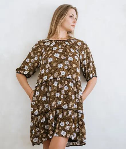 This tiered babydoll dress is ethically crafted from a beautiful sustainable georgette and has endless styling options whether you want to create a casual look or dress her up with your favorite boots or heels. If you are looking to create a little more shape, tie her up at the waist to transform her into a flirty and feminine look. Did we mention she has pockets?