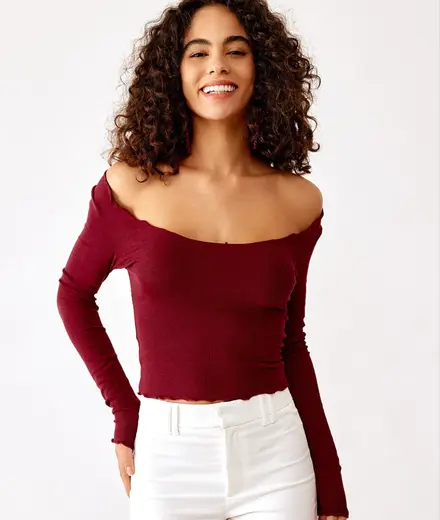 This skin tight lettuce trimmed long sleeve is a perfect accent to your everyday tee. With a flattering scoop neck and ribbed sustainable fabric.
