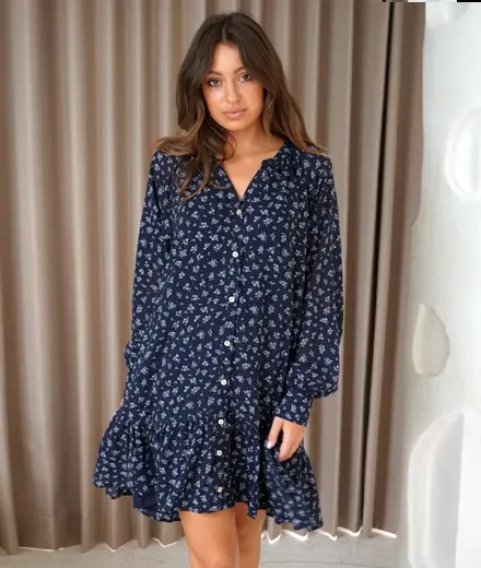 Featuring a classic button front with real shell buttons, pockets, and crafted in a soft, lightweight sustainable cotton print. Ella comes with a removable sash to cinch your waist or you can style her relaxed and loose.