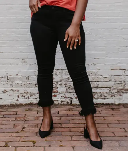 Ultra chic in jet black, these cropped skinnies have the added flair of a shredded fringe hem. They are unbelievably soft, smooth and stretchy as yoga pants.