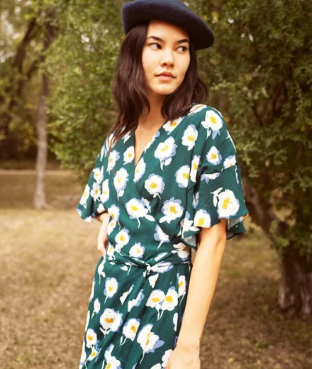 Flowy and feminine, this dark green floral wrap dress is the perfect balance of practicality and fun.