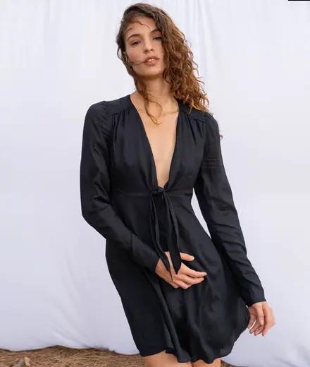 The tie front neckline creates a flattering shape for any occasion. Holly's silky soft fabric and smocked back make this the ultimate comfortable and chic party dress. Perfect for dressing up or down.