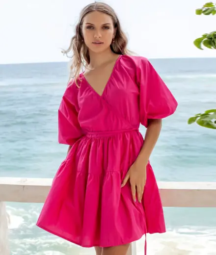 Designed and handmade in flattering wrap silhouette with puff sleeves and voluminous two tier skirt, this dress radiates endless feminine charm and will be your go-to summer piece.