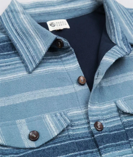 • 100% organic cotton fabric • Beautifully woven striped outer layer • Lined with our organic cotton jersey • Roomy chest pockets and side pockets • Relaxed, comfy. all-gender fit • Buttons made from Indian Rosewood