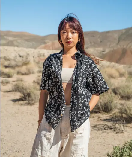 A boxy unisex button down featuring complex geometric patterns that create starry constellations symbolizing community.