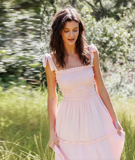 Featuring a smocked bodice, adjustable bra-friendly ties, and crafted in a flowing sustainable, soft textured fabric, you'll fall in love with this dress every time you wear it. The beautiful blushing pink color will brighten up any day.