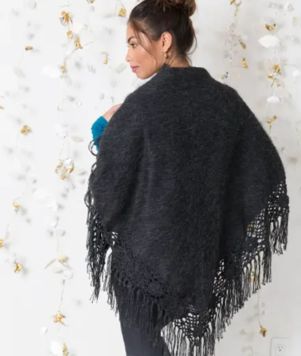 An elegant choice for any occasion, this soft triangle shawl is cozy and warm, with a fantastic boho-chic crochet fringe.